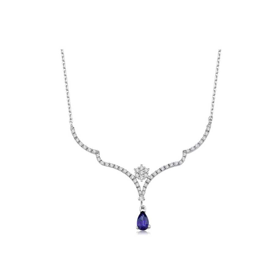 Maden: Altın | Renk: Beyaz | Ayar: 14K |Taş: Pırlanta + Safir | Pırlanta Karat: 0.27 | Safir Karat: 0.23 | Berraklık: F-G SI | Ağırlık : 2.65 gr | Zincir: 42 cm |